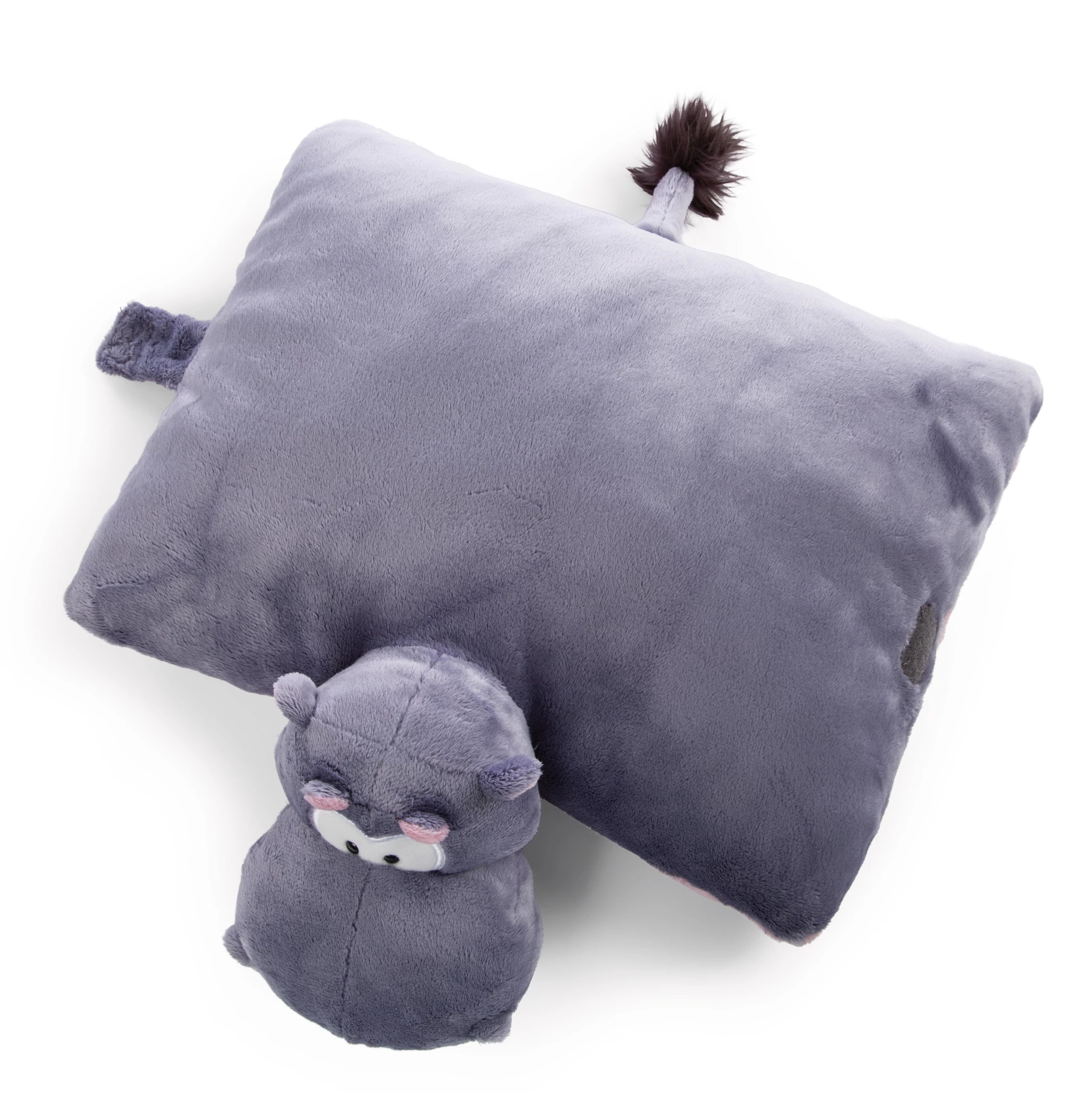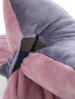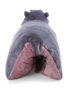Mittels Klettverschluss kann das Kissen geschlossen werden und es entsteht ein stehendes Nilpferd. Geöffnet hat man ein Kuschelkissen.